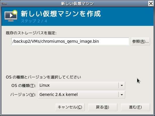 続けて、既存のストレージパスを聞かれるので、上で作成したKVM用イメージを選択します。OSはLinux、バージョンはGeneric 2.6.x Kernelを選びました。