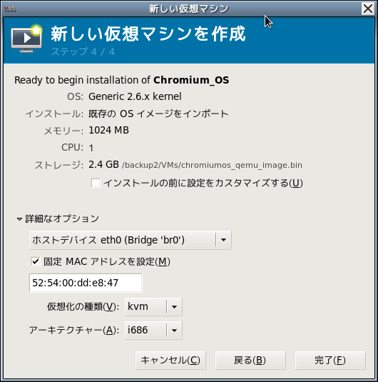 これでここまでの設定概要が表示されるので、「詳細なオプション」をクリックして、仮想化の種類にkvm、アーキテクチャにi686を選んで完了をクリックします。